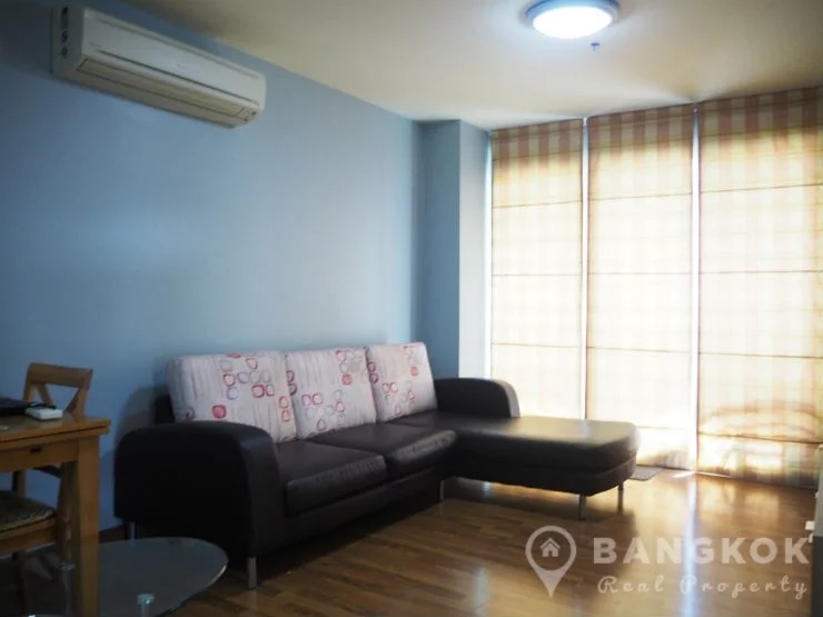 On a low floor of Sukhumvit Plus Condominium this spacious unit has 2 bedrooms (2 doubles), 2 modern bathrooms (master ensuite) and 70 sq.m of living space with a balcony with un-blocked views at the back of the building away from the noise of Sukhumvit road. The unit has wooden floors throughout and comes fully furnished with excellent wardrobe and storage space.