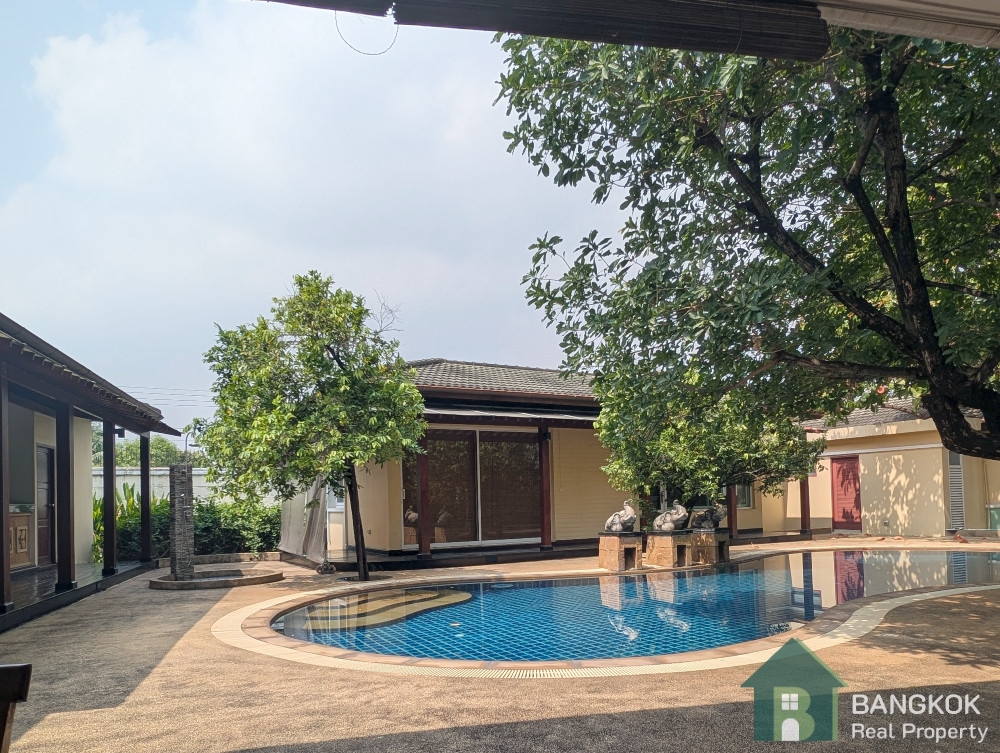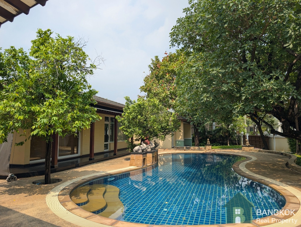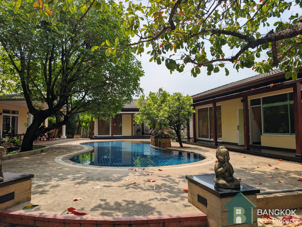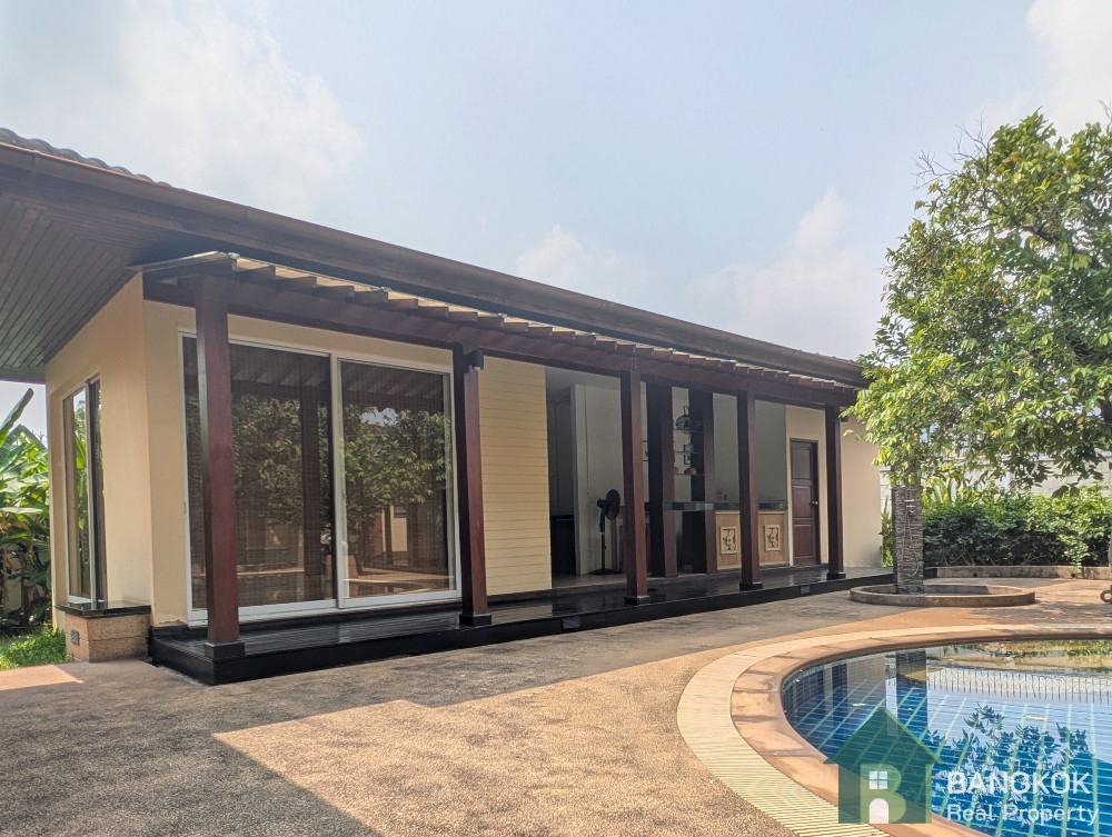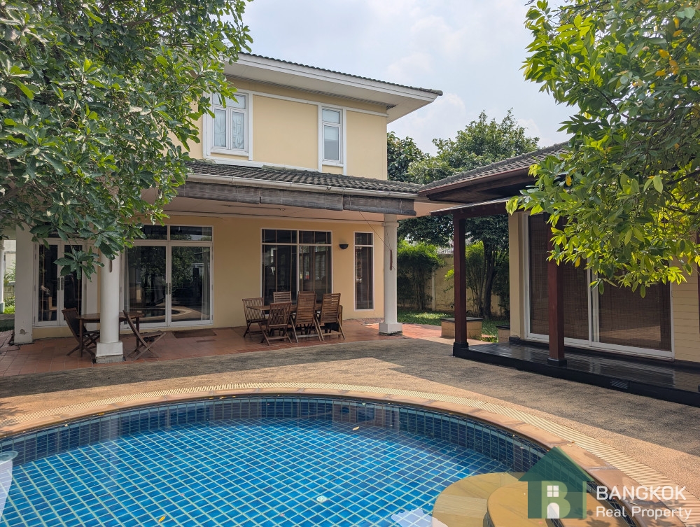 This detached family home compound with private swimming pool is available for Sale in Baan Ladprao Village conveniently located just off Soi Yothin Phatthana 11, adjacent the Crystal Design Center (CDC) and the Chalong Rat Expressway. The Village built in 2003 by Golden Land Property Development has a variety of local amenities at hand including Central Eastville, NIVA American International School and MRT Lat Phrao 83 (Yellow Line) is a short drive away.
