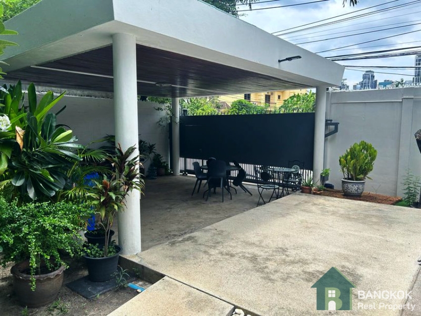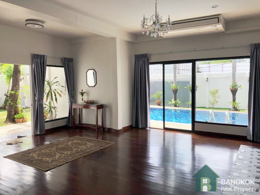 This modern, detached, 3+1 bedroom house with private swimming pool is available to rent, superbly located just off Sukhumvit 63 and within easy reach Ekkamai BTS station. This contemporary house is set in its own private gardens with pool.