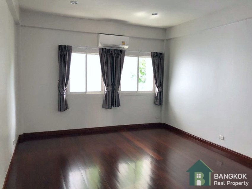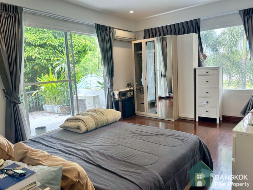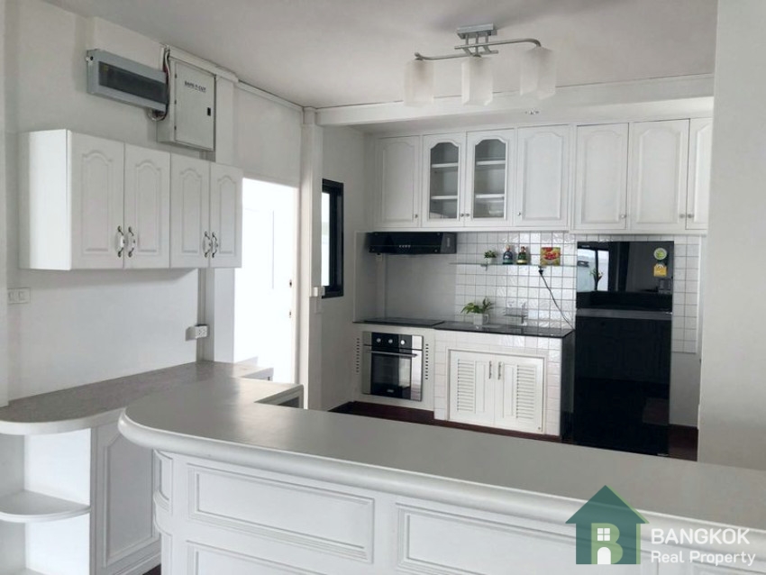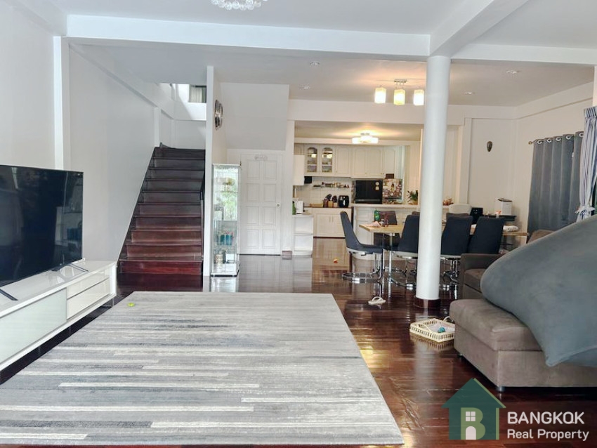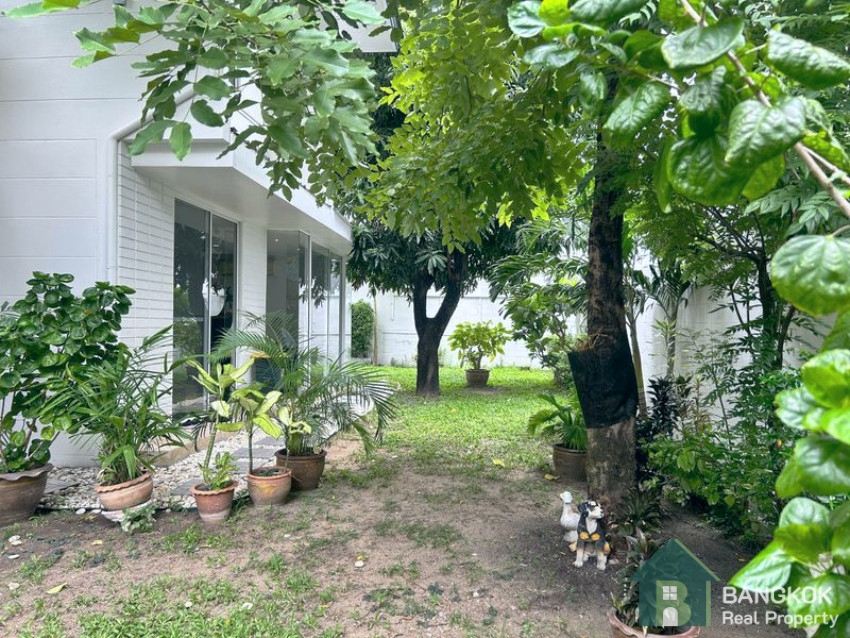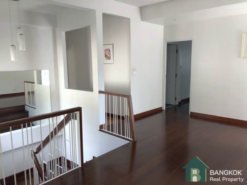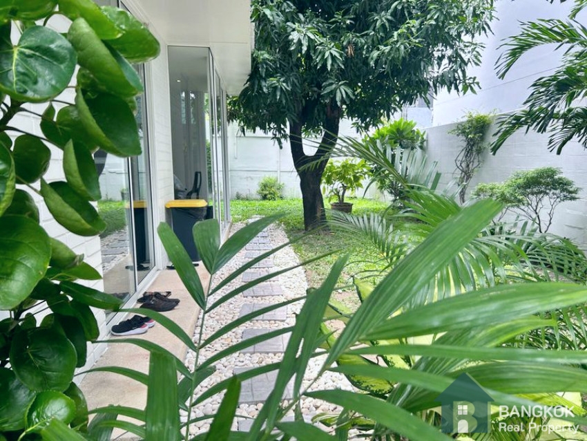 This spacious, modern is set over 2 floors, with 3 double bedrooms (master en-suite), 1 large study room, 3 modern bathrooms, spacious living + dining room opening to the pool, large western style kitchen with oven, 1 maids room, good storage, 420 sq.m, on a plot of 143 sq.wah (575 sq.m) with mature garden and private swimming pool. There is covered parking for 2 – 3 cars.
