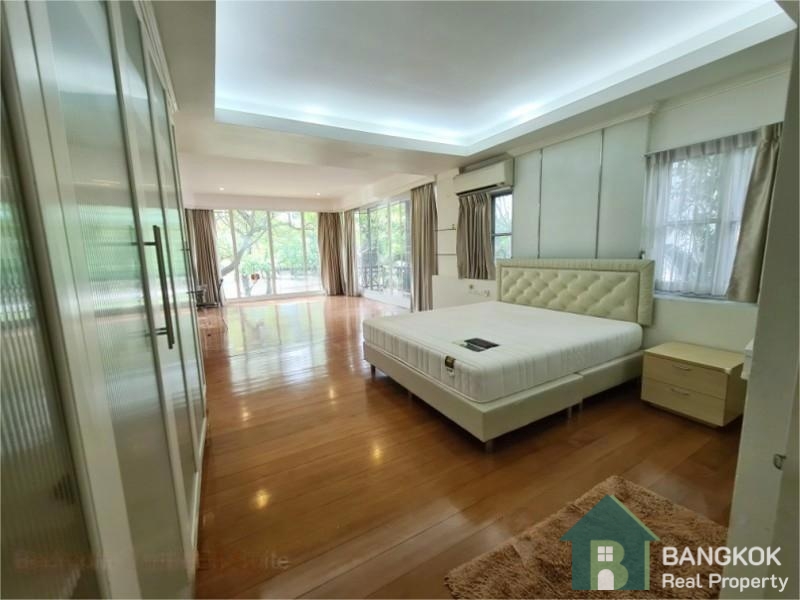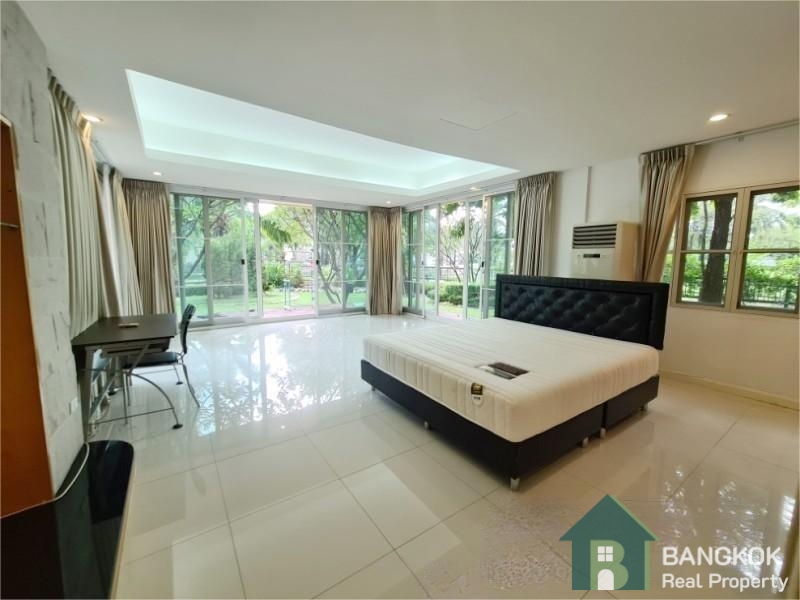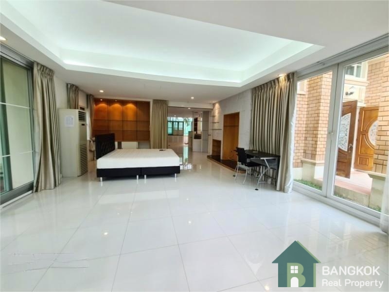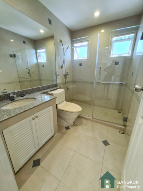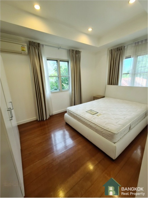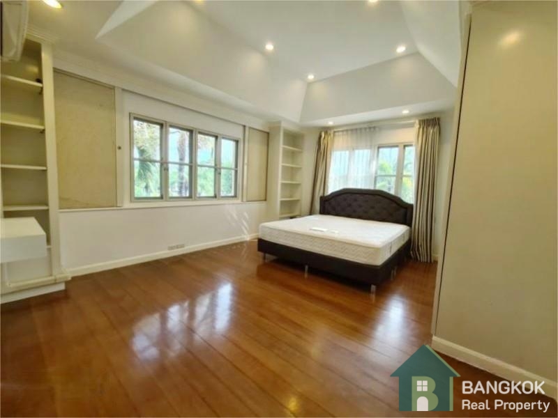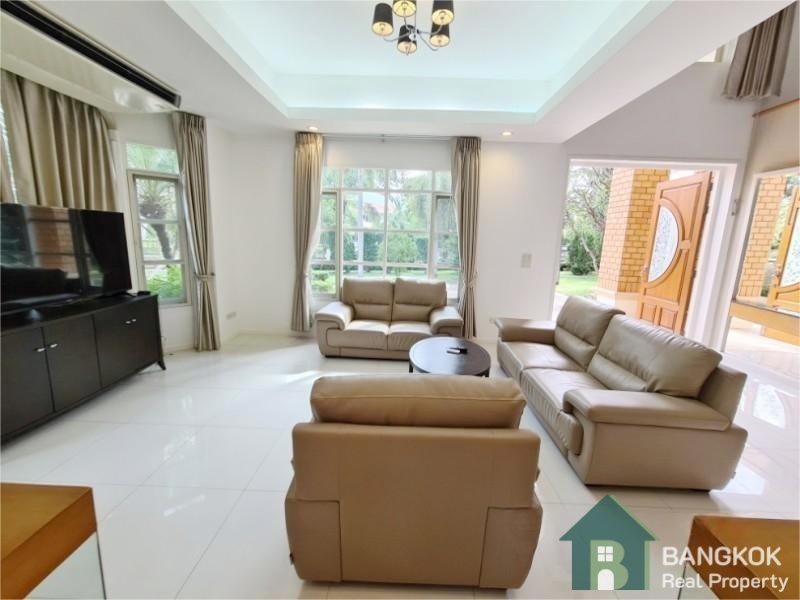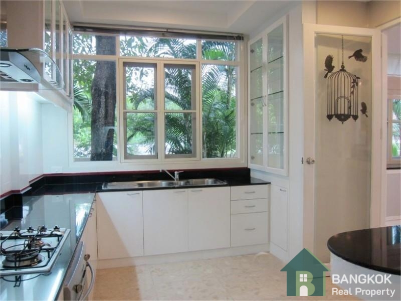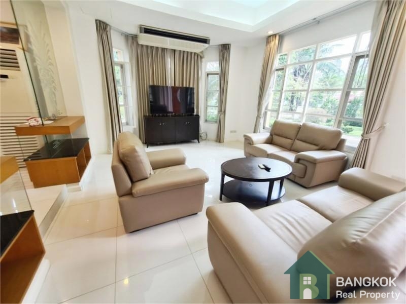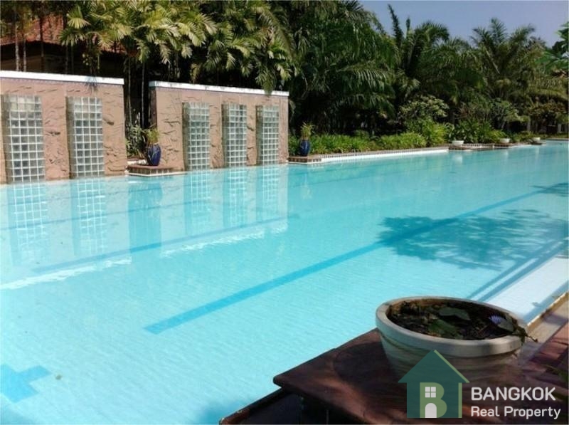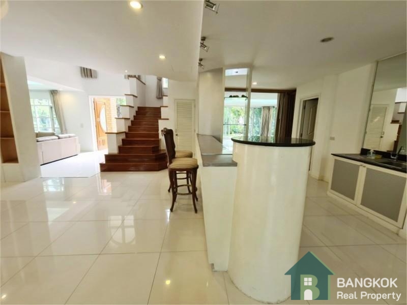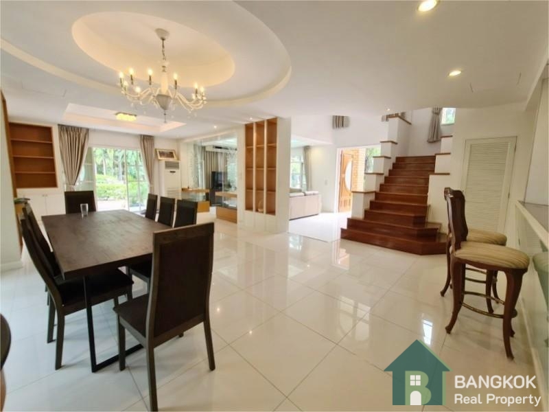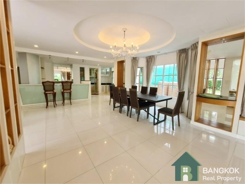 This spacious family home has 3 receptions rooms (Living – Dining – Family), 4 bedrooms (2 en-suite), 4 bathrooms, 2 separate maid rooms, Western Kitchen with electric oven and 450 sq.m of living space with a large lush garden and lawn. The house sits on 313 sq.wah (1,252 sq.m) with a car port and space for 3 – 4 cars.