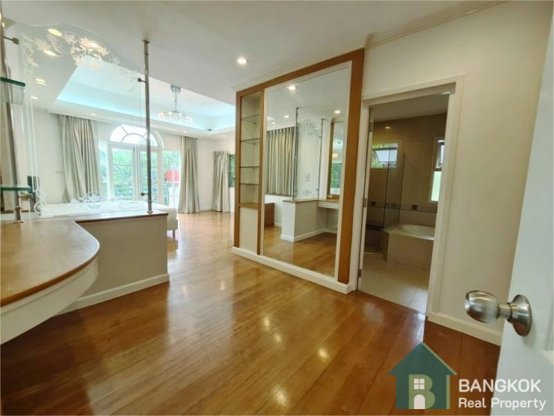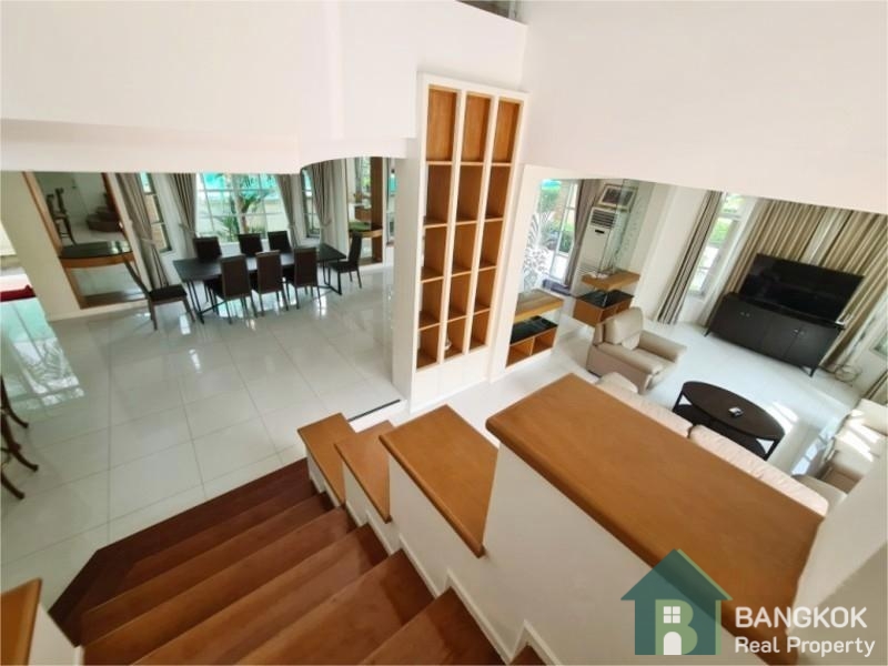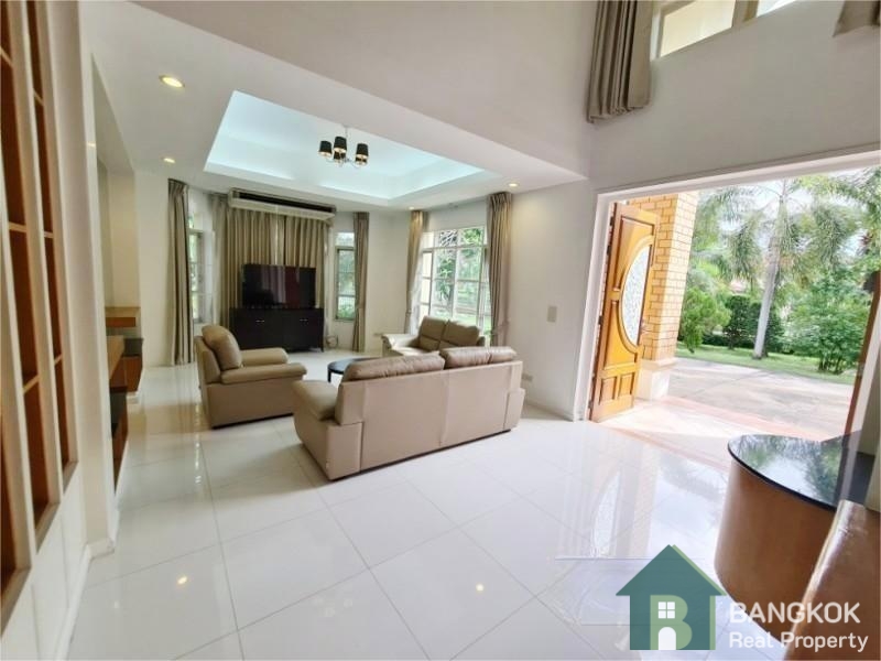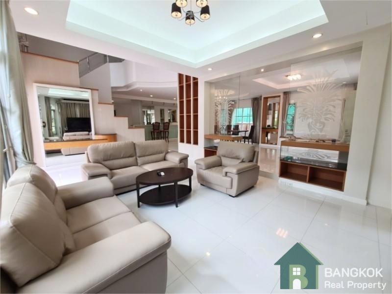 This elegant, well appointed, detached 4 bedroom bedroom family home is available to rent at Nantawan Srinakarin Village, an established and popular secure compound located just off Srinakarin Road. This gated development by Land & House has easy access to local amenities including Robinson Lifestyle Samut Prakan, Major Cineplex Lotus Srinakarin, Foodland Srinakarin, Paolo Samut Prakan Hospital and Bangkok Patana International School. The village is 8 minutes drive (4.8 KM) from BTS Royal Thai Naval Academy and just 9 minutes drive (5.6 KM) from the newly opened Yellow Line MRT Si Thepha station.