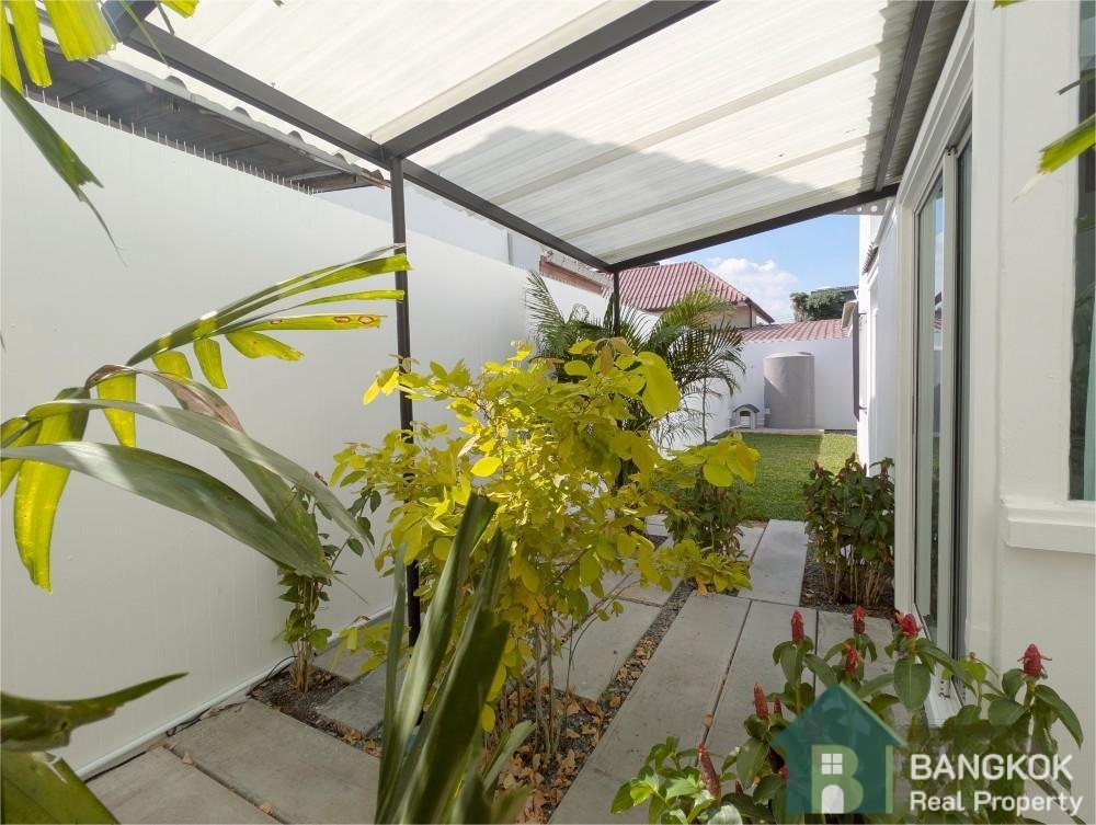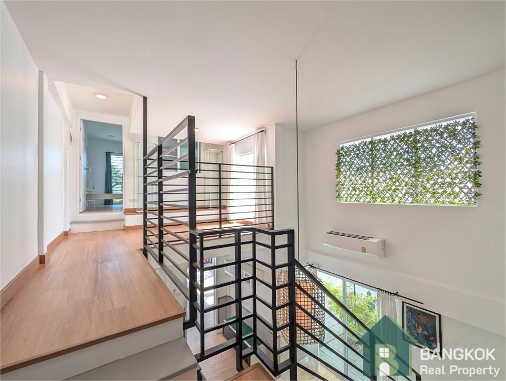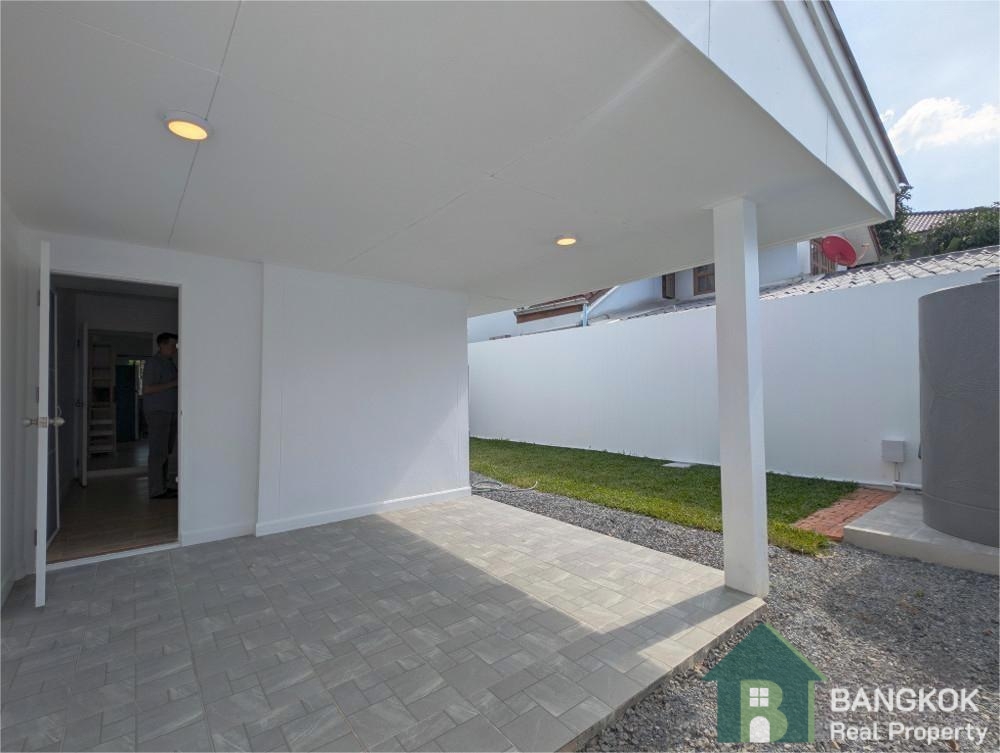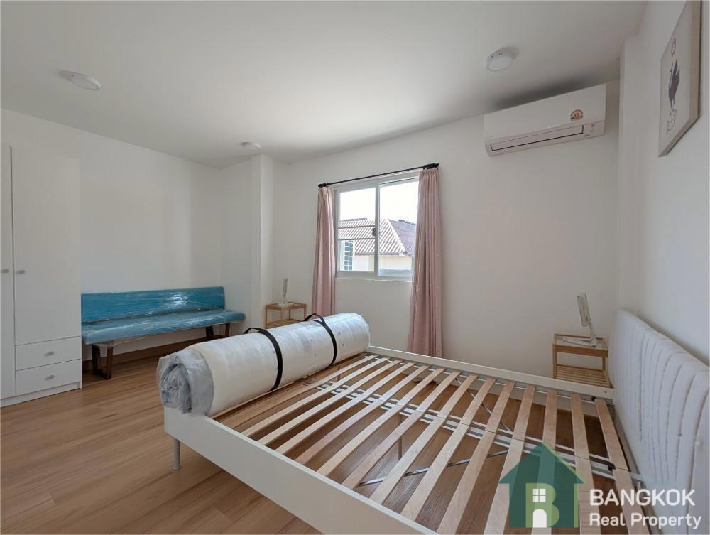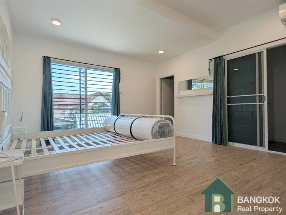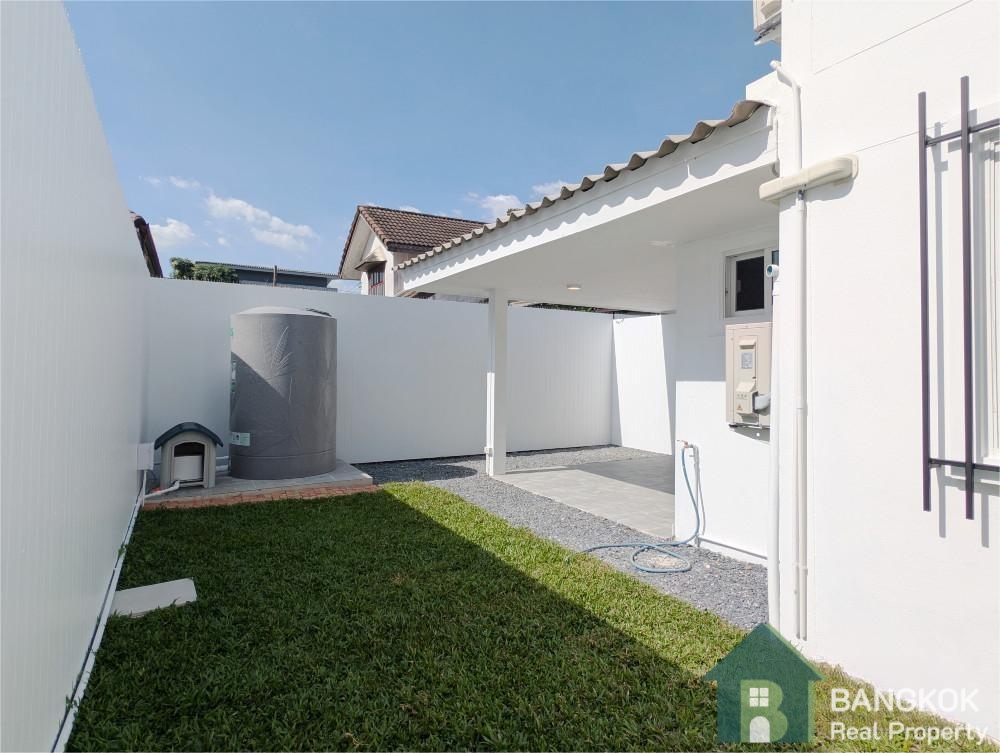 This newly renovated, spacious, twin (semi-detached) 3 bedroom house, just completed in late 2025, is available to rent ideally situated within the very popular Sammakorn Village located just off Ramkhamhaeng Road. Located in a quiet residential area of the village near the many lakeside restaurants and other amenities.