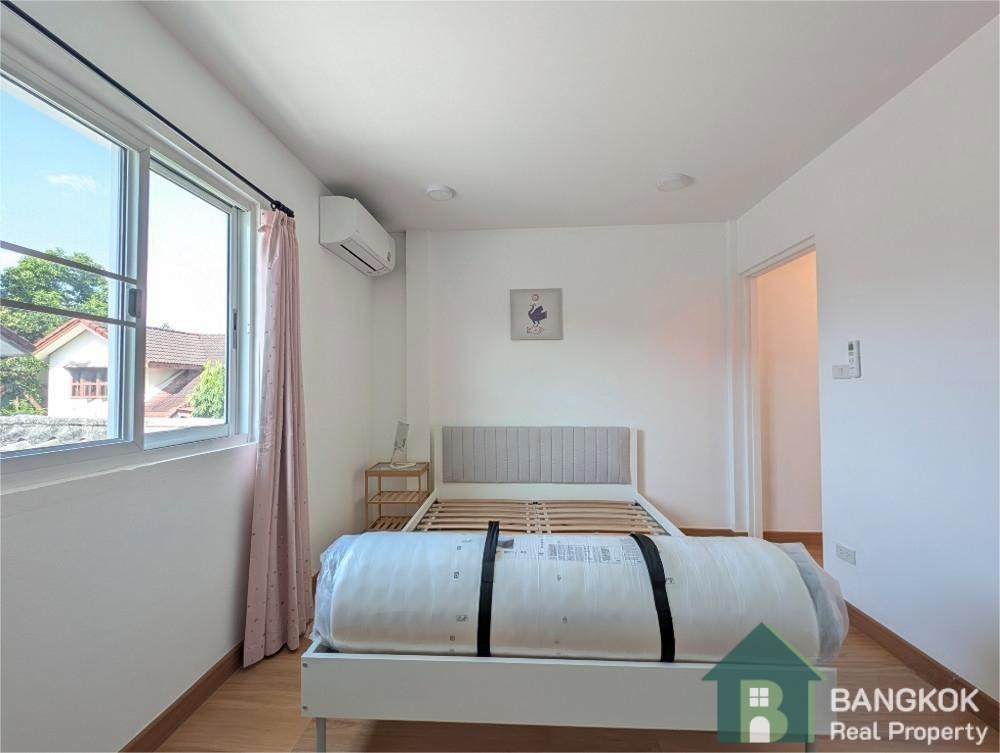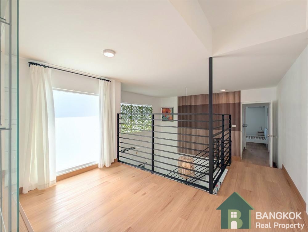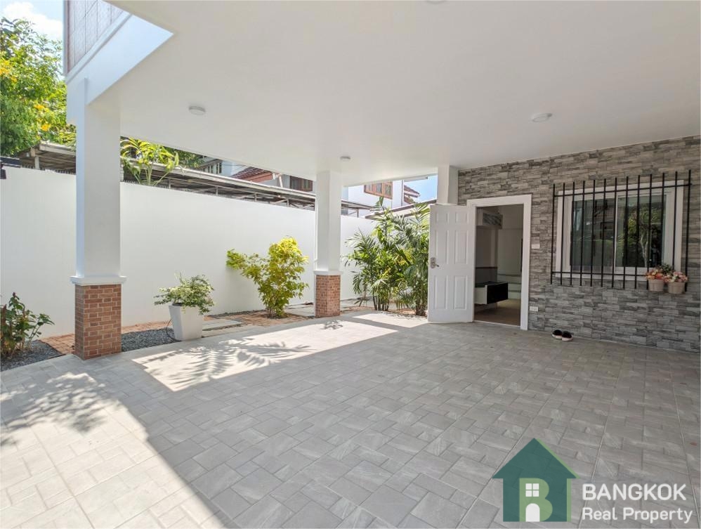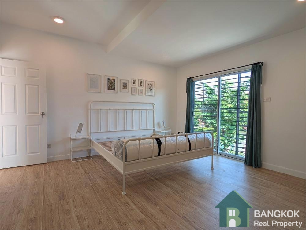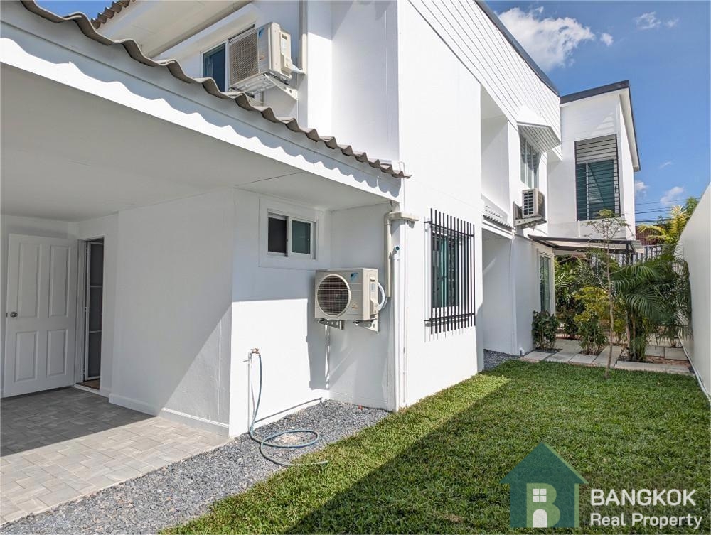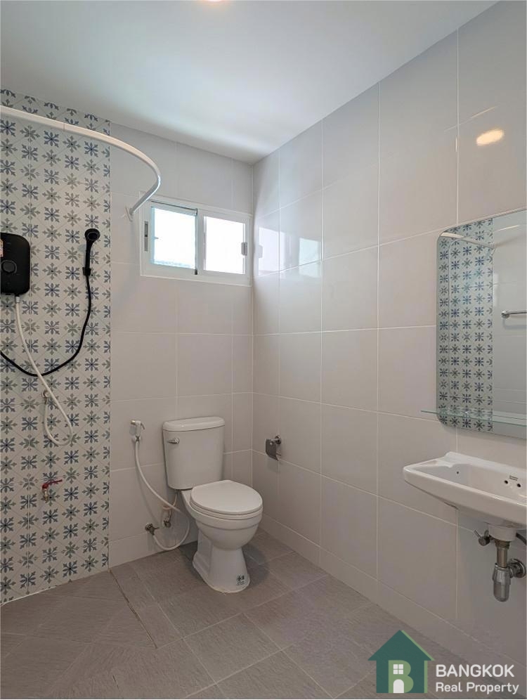 This newly renovated, spacious, twin (semi-detached) 3 bedroom house, just completed in late 2025, is available to rent ideally situated within the very popular Sammakorn Village located just off Ramkhamhaeng Road. Located in a quiet residential area of the village near the many lakeside restaurants and other amenities.